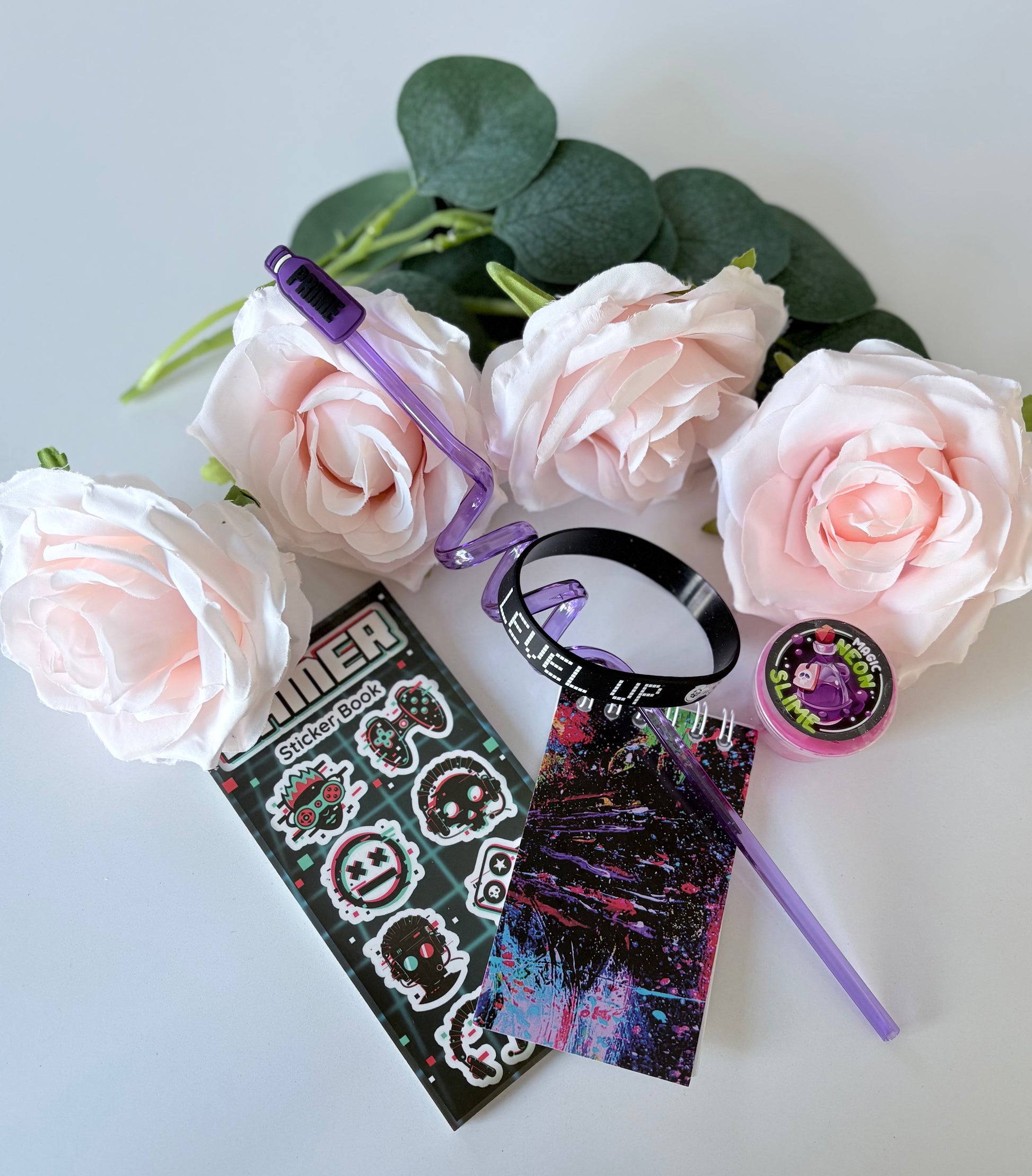 This comprehensive gaming-themed collection brings together 14 carefully curated items designed to delight enthusiasts of all ages. The assortment features practical accessories including pixel-style gaming glasses and a reusable straw, alongside creative supplies such as colouring pencils, a puzzle and activity book, and a neon slime pot. Complementing these essentials are collectible pieces, gaming playing cards, a silicone wristband, temporary tattoos, stickers and a keyring, each celebrating gaming culture. The inclusion of a notepad and eraser rounds out a versatile gift box that balances functionality with entertainment value, making it an ideal present for gamers seeking both utility and enjoyment.
