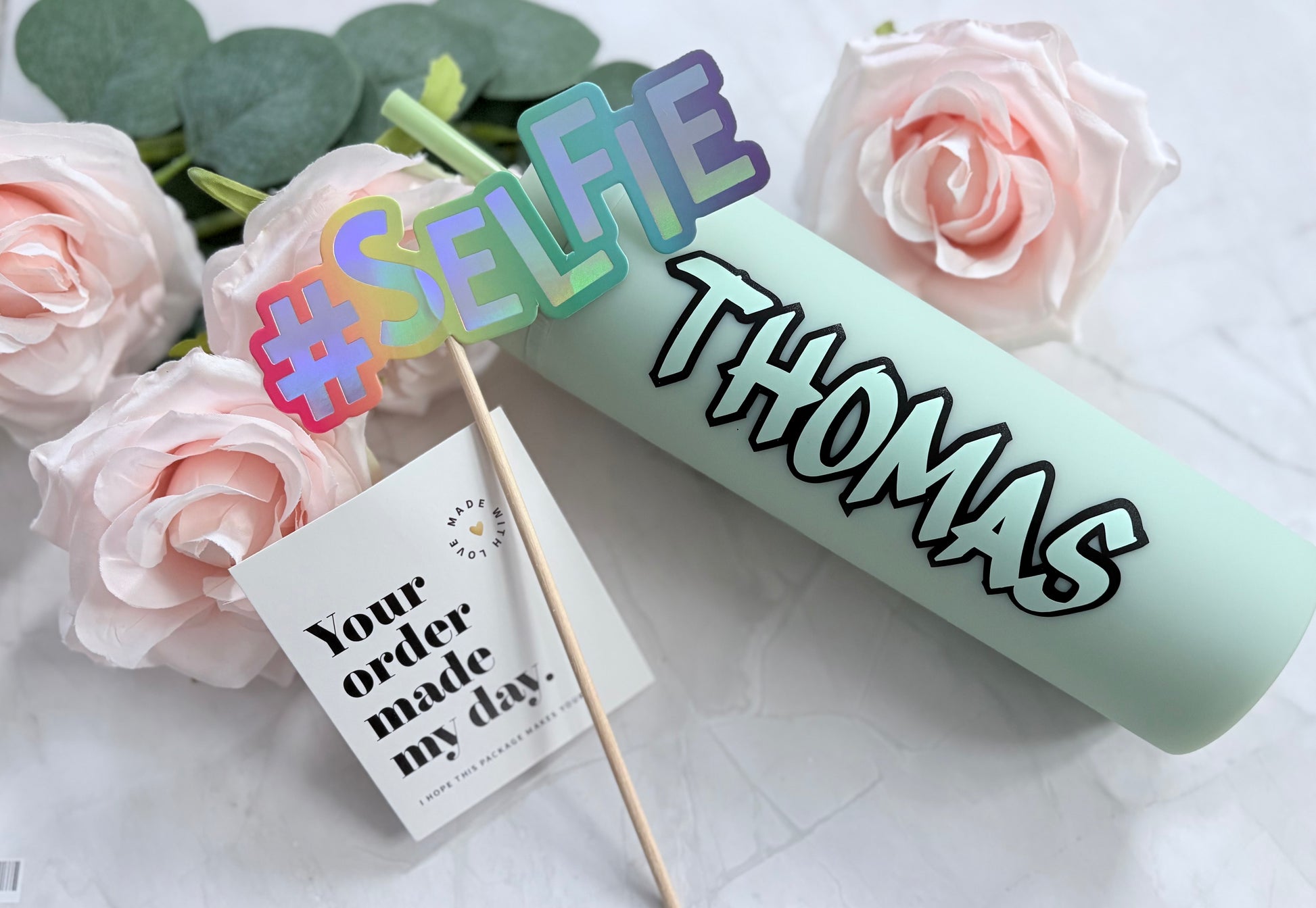 This bespoke bottle features a striking contrast between matte black and a matte mint green vinyl applied to showcase your chosen name with exceptional visual impact. Each personalisation is meticulously crafted using premium-grade materials, ensuring durability and a refined finish that elevates your drinkware collection.