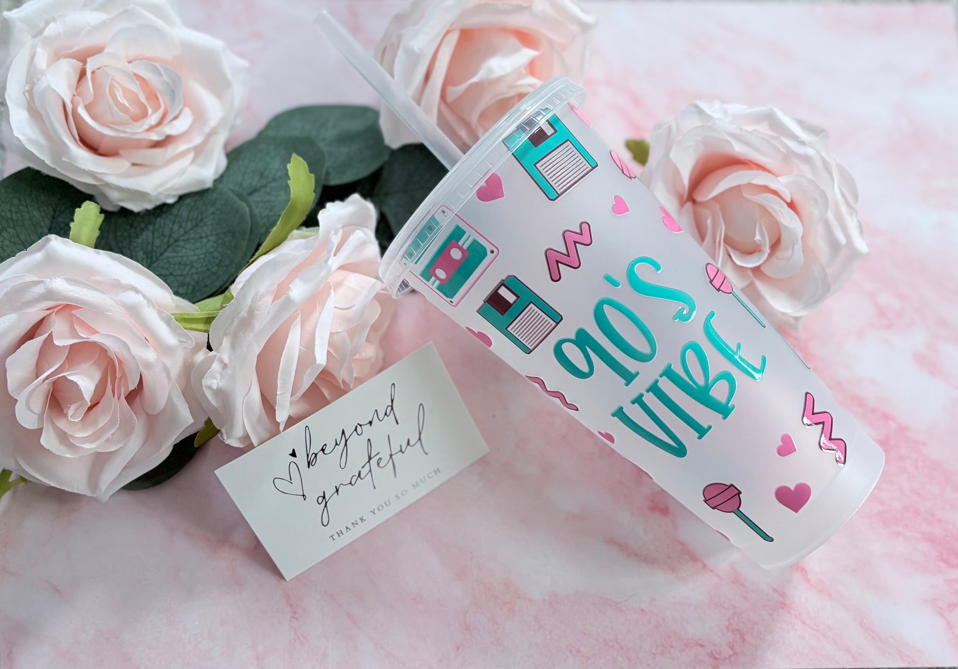 Transport yourself to an era of iconic style with this 24oz cold cup, a tribute to 90's culture and nostalgia. Perfectly sized, this beautiful design captures the essence of a beloved decade. Ideal for those who cherish memories of growing up through the 90's, it celebrates retro aesthetics.